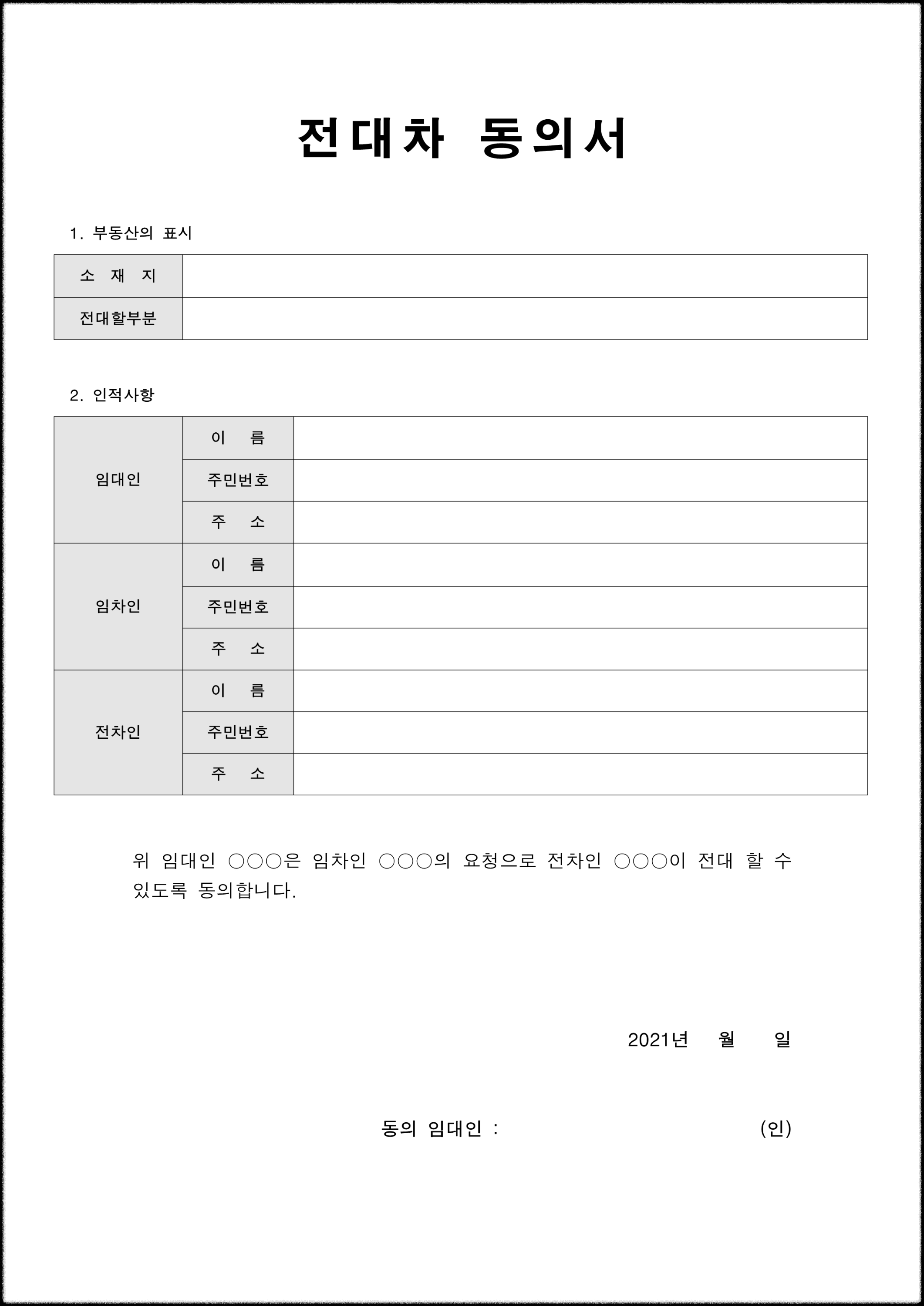 또 임대인의 동의서가 없는 경우 전차인은 법적인 보호를 받을 수 없기 때문에 부동산 전대차계약서를 작성한다면 꼭 필요한 서류가 임대인 동의서입니다.